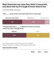 يتعامل كثير من الأميركيين يوميًا مع الأخبار غير الدقيقة، ويجد نصفهم تقريبًا صعوبة في التمييز بين الحقيقة والزيف عند استهلاك الأخبار. تسعة من كل عشرة بالغين يقولون إنهم يصادفون معلومات يشكّون في صحتها على الأقل أحيانًا، فيما يؤكد 42% أن ذلك يحدث لهم «كثيرًا» أو «كثيرًا جدًا». وفي المقابل، ينقسم الجمهور حول القدرة على التمييز: 51% يرون المهمة «صعبة»، مقابل 49% يقولون إنها «سهلة». هذه الصورة تعكس اتساع نطاق التضليل الرقمي وتضع الثقة في الإعلام تحت ضغط متزايد.