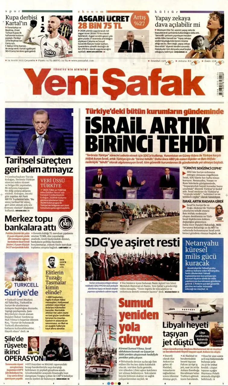 تضع صحيفة «يني شفق» التركية الموالية للحكومة إسرائيل في قلب دائرة الاتهام، معلنة في عنوان بارز على صفحتها الأولى أنّ «إسرائيل هي العدو رقم واحد»، في خطوة تعكس تصعّدًا ملحوظًا في خطاب الإعلام القريب من السلطة في أنقرة تجاه تل أبيب والاصطفافات الجديدة في شرق المتوسط.