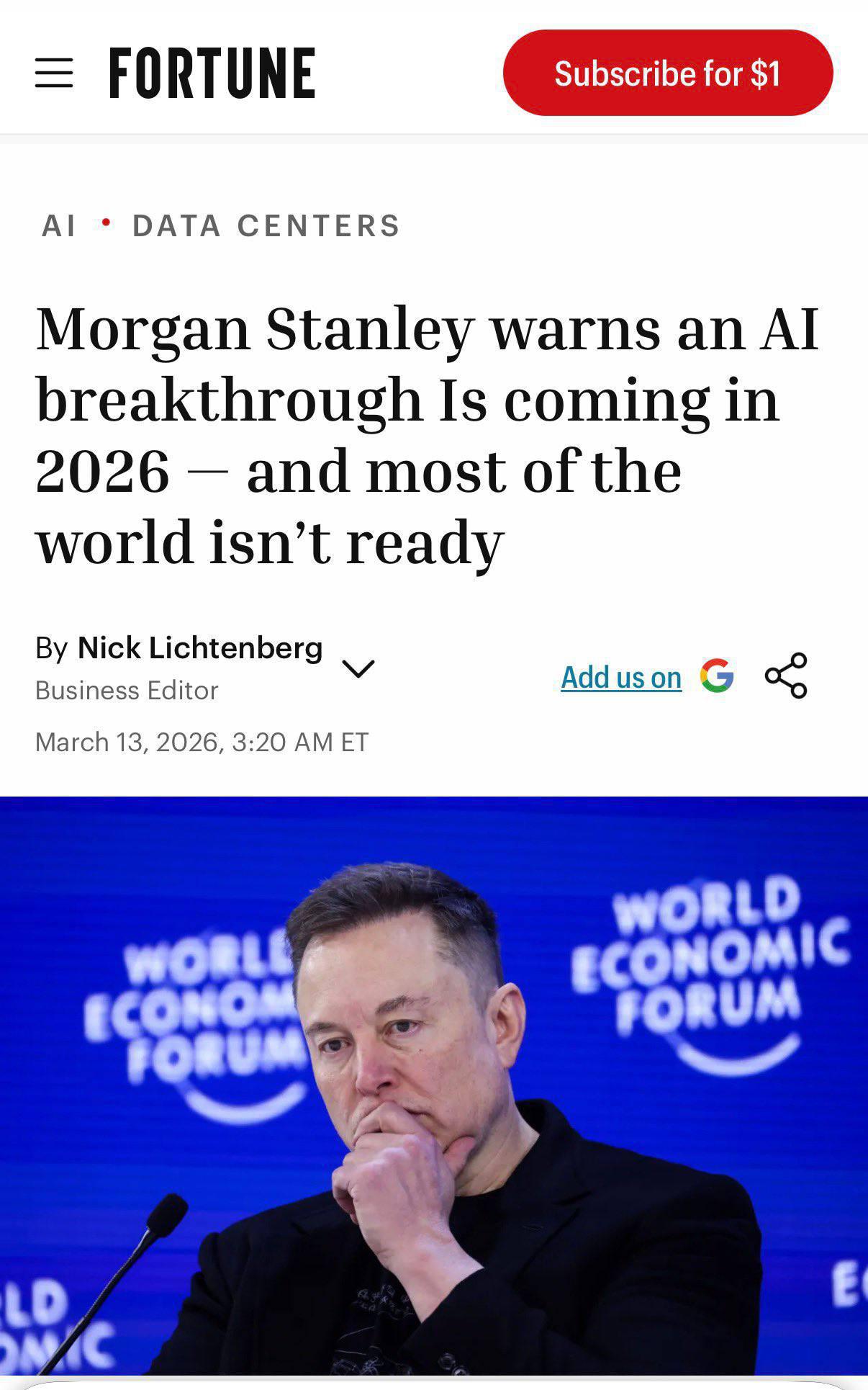 وفق تحذير حديث من بنك الاستثمار الأميركي مورغان ستانلي، العالم على أعتاب قفزة ذكاء اصطناعي استثنائية. ويرى البنك أن أغلب الاقتصادات والمؤسسات لم تتهيأ بعد لتبعاتها.