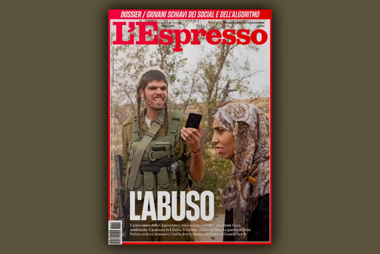 أثار الغلاف الأخير لمجلة “ل’Espresso” الإيطالية جدلاً سياسياً وإعلامياً واسعاً بعد أن خصصت عددها الصادر يوم 10 أبريل لانتقاد ما تعتبره المجلة “تجاوزات” الحكومة الإسرائيلية في غزة والضفة الغربية. اختارت المجلة صورة قوية كواجهة للعدد: رجل يبدو في هيئة مستوطن – يوصف في التعليق كـ“مستعمر” ذي ملامح متدينة (الـ“بيوط” أو الخصل الجانبية عند اليهود المتدينين) – يبتسم ابتسامة توصف بالسخرية أو القسوة في وجه امرأة يُفترض أنها فلسطينية، وسط حقل للزيتون غرب الخليل. رافقت الصورة كلمة واحدة بارزة على الغلاف هي “L’Abuso” (الانتهاك/التعسف)، مع نص سفلي يتهم اليمين الصهيوني بالسعي إلى “إعطاء شكل لـ«إسرائيل الكبرى»” عبر ضم الضفة الغربية، تدمير غزة، التوسع في لبنان، خرق الحدود السورية، شن الحرب على إيران، وارتكاب “تطهير عرقي ومجازر”.